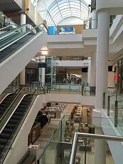 The old, outdoor shops were demolished in August 1987 except for a row of three stores next to the Mahoneys Road pedestrian entrance, which remain there today. The split-level indoor "Marketplace" addition, completed in 1976, was also retained but majorly reconfigured to accommodate new tenancies including a multi-level Harris Scarfe store.[85]T he first stage of the expanded centre opened on 12 September 1989, and 113 shops were operating by July 1990.[86] The second stage of the redevelopment was officially completed by December 1990.[77] Fifty-nine shops from the old section were relocated to the new centre. The Hoyts 10 cinema complex opened on the third level on 26 December 1989 with 10 screens and 2,500 seats.[87][88]