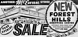In July 1964, it was announced that Coles would build a 930m² variety store at Forest Hills, completing the second stage of the centre's development.[38] This eventually opened in early 1965, and was originally managed by Ken Overend.[39] During the second half of 1964, new stores were opening at Forest Hills weekly including popular tenants Bradmans (4th December), Dobsons (21st December), Palmer & Son (3rd December), Hannams, the State Savings and ANZ Banks, Sussans, Edments, Hartleys and the Toy Emporium.[40]