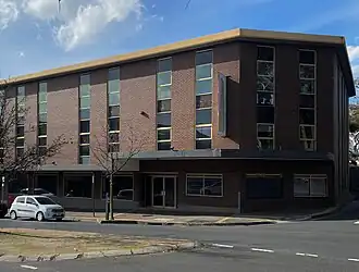 As included in the original 1959 development plan, a multi-storey building comprising a sports centre, office suites, and two small shops was constructed at 69-79 Mahoneys Road.[66] Designed in the post-war International Style by Thord Lorich & Associates, the complex opened in 1969 and became one of the tallest commercial buildings in the City of Nunawading (now Whitehorse). The building was engineered to be extended vertically in future (although this never eventuated), and retains its period features including polished terrazzo flooring, brown brick veneer, brass balustrades, textured ceilings, decorative timber wall panelling and the original Johns & Waygood elevator.[67]