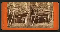 The Forest King was felled by excavating its roots. Sneidiker & Stegman Exhibit Stereoscopic Card, 1870.[6]: 47