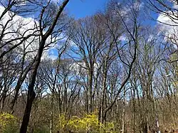 Forest Park is situated atop the Harbor Hill Moraine,[5][63] which, at the time of the park's construction, was a heavily forested ridge.[15] The highest point in the park is about 180 feet (55 m) above sea level.[44] The park contains approximately 411 acres (166 ha) of hickory and oak trees.[62] These include a 165-acre (67 ha) forested section in the eastern half of the park. In addition, Forest Park contains 7 miles (11 km) of bridle paths.[61]