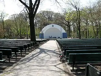 Forest Park also offers a wide array of recreational facilities, the Carousel,[70][71] playgrounds,[72] a pond,[73] a barbecue area,[74] a nature center,[75] and two dog runs. Dogs can run off leash here, and there is a separate area for small dogs.[76][77] Therapeutic horseback riding for people with special needs is also available in the park.[78] The park includes the George Seuffert Sr. Bandshell,[79] which was named after a bandleader in 1979.[68]