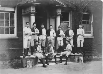 Forest had an important role in the development and creation of association football, and the common at the front of the school may well be regarded as a "cradle of the game".[5] In the school's early years there was no sport apart from informal kick-about by the pupils, but by the 1840s cricket was played and hockey was in vogue in the early 1850s. Football began at Forest in 1857 when Frederick Guy took over as headmaster; it was played on the common, at the front of the school. The common was a rather uneven playing surface, with the great chestnut trees at the side of the pitch "in play" and some famous iron railings marking the north end of the pitch. Tradition records some great battles between Charles W. Alcock and F.J. Poole, in which the object was to barge the other player over the iron railings![3] The earliest reported match against another school was in Forest's first season on 24 February 1858, when Forest beat Chigwell School 5-4 on the common.[6] Another early game was on Saturday 16 November 1861, when Forest School, (playing as "Walthamstow"), lost to a Westminster School side (playing as "Bounding Bricks") by three goals to nil.[7] A return match was played four weeks later, and in 1862 the school played against Old Westminsters (playing as Elizabethan Club).[8]