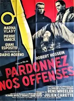 Forgive Us Our Trespasses (French: Pardonnez nos offenses) is a 1956 French drama film directed by Robert Hossein and starring Marina Vlady, Pierre Vaneck and Giani Esposito.[1] [2] [3] It was shot at the Billancourt Studios in Paris. The film's sets were designed by the art director Jean Mandaroux.