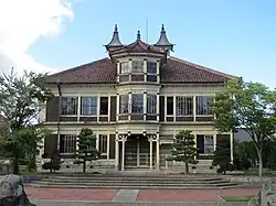 The design of the building is attributed to Egawa Saburōhachi (江川三郎八), whose plan was executed by carpenter Ogasawara Kunitarō (大工小笠原国太郎) of Iizaka. The house is made of wood and includes two floors of tatami mat rooms, as well as an attic floor with an East Asian hip-and-gable roof covered in tile. The exterior of the house is pale yellow in color and takes on a Western appearance. In the center of the facade of the house is a tower with an eight sided room protruding from the third floor. The interior of the house is Japanese is style. Wide washitsu rooms are arranged in the center of each floor.[1] Detailed woodwork using valuable wood, including Japanese zelkova and imports from Southeast Asia are spread throughout the house. Two rooms on the first floor are especially well decorated, including the ceiling and wall fixtures of the main living room.[2] On July 25, 2016, the house was designated as an important cultural property of Japan.[1]