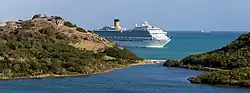 ![]() Remains of Fort Barrington on Goat Hill (left), with cruise ship passing behind it | |