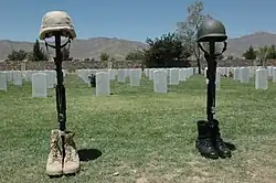 ![]() Traditional rifle, helmet, and boots memorial honor at Fort Bliss National Cemetery | |