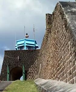 The fort is the home of the Fort Charlotte Light, which acts as a beacon for the entrance to Kingstown Bay, it gives off three white flashes every 20 seconds. The Coastguard radio station and harbour signal station are based here too.[3][4][5][6][7][8]