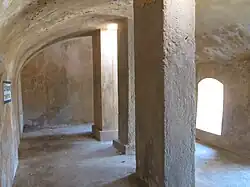 Fort Dansborg is located in the southern part of Tharangambadi, located 283 km (176 mi) from the state capital Chennai. It is built in Danish style, characterized by large halls, columned structures, high ceilings and projecting drapery.[18] The length of the fort in the side facing the sea is 60 m (200 ft) and the width is about 11 m (36 ft). The fort is trapezoidal in shape with three rooms in the left wing, originally used as the governor's residence, a kitchen with an open fireplace and chimney in the top left hand corner, and a church room, now a museum, located in the centre of the building. The original rectory and the northern part of it, which are now the store rooms, are located in the right wing. The corner room on the right side was the residence of the commercial director. In modern times, it is used as a store room. The core of the building is made of brick. The main door of the fort faces north, while an additional door faces the east.[21][22][23][24] The second storey of the fort has a set of guard rooms.[25] The staircase leading to it are built with bricks.[26] The central part of the fort has four camel hump shaped domes. The central pillar of the hall holds the entire weight of the domes.[23]