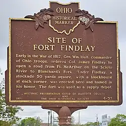 Fort Findlay was erected in northwestern Ohio in 1812[1] as part of United States defenses during the War of 1812. It was established by Col. James Findlay under the orders of General Hull, and named in honor of the colonel. The stockade-style fort had blockhouses at each corner and comprised about fifty square yards total space. The fort was garrisoned by a company under the command of Captain Arthur Thomas during the War of 1812.
