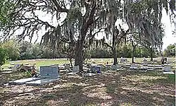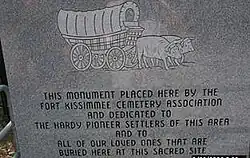 After the third Seminole Indian War, the community along the Kissimmee River was attractive to cattle ranchers and laborers because of the vast prairie land to raise cattle. The living conditions in the Kissimmee Valley was primitive and required someone with grit and a hard work ethic to overcome the harsh conditions. As the community grew, they began to build a church and a school at Fort Kissimmee. A tragedy happened in the community, around 1890, while building the school house near the current location of the cemetery. Two men named John Sheffield and a man with the last name Shaw got into a violent argument in which both went for their shotguns and shot each other. John's two small boys, John Lewis and Tom Sheffield, stood and watched as they fired their guns at the same time. Both families used lumber from the old school house to build the two men coffins and buried them near the site of the school house.[1] This was the beginning of the Fort Kissimmee Cemetery.