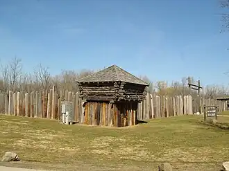 Fort Koshkonong (Fort Cosconong) was a military fort located near the present-day city of Fort Atkinson, Wisconsin. Intended to control the confluence of the Bark and Rock rivers, it was used as a station for local militia units and the U.S. regulars in the region to scout the British Band, a group of Native Americans who fought against government units during the 1832 Black Hawk War. General Henry Atkinson was the commander of the fort during the war.[1][2] Black Hawk was in the same general area, but evaded capture and started to flee towards the Wisconsin River. The original fort was abandoned by the Army following the conflict. Local settlers dismantled it for the wood as the town developed.