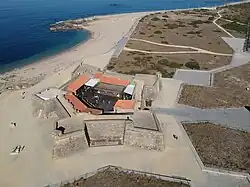 The structure has a pentagon shape with pentagon bastions at the edges, in the Vauban style. The walls are made of sloped stone, topped by vertical parapets. In three of the five bastions, watchtowers have a quadrangular plan.
