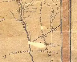 Fort Scott was built in 1816 on the west bank of the Flint River, where it joins the Chattahoochee River to form the Apalachicola, in the southwest corner of Georgia.[2]: 16 It was named for Lieutenant Richard W. Scott, who was killed in the Scott Massacre of 1817 and never known to have visited the fort.[3]: 53 (The fort replaced a much smaller fort or stockade, named Camp Crawford for Secretary of War William H. Crawford,[3]: 28 and not to be confused with Fort Crawford (Alabama).[3]: 52–53 ) The need for a fort became evident during the War of 1812, when the British identified the undefended United States border and in 1814 built two forts on the Apalachicola River into which the Flint River flows: a strong fort at Prospect Bluff and a smaller one, Nicolls' Outpost, at the river juncture. This was in Spanish Florida, but Spain had neither the resources nor the inclination to do anything about the fort in a location that was remote.