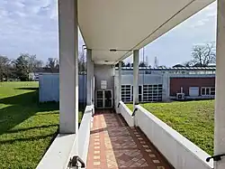 Fort d'Ivry dominates a crossroads just to the north of the fort, one of the major approaches to Paris leading to the Porte d'Ivry in the Thiers wall. The pentagonal fort has bastions at each of its five points. The original construction is in stone, with rough stone for the majority of exterior surfaces and dressed stone for accents, gates and window surrounds. A ditch, which still exists on three sides, lies outside the walls. One side of the fort's wall is pierced with 18 casemates, while the others have a parapet shielding a covered walkway. Casemates are also cut into the flanks of the bastions to provide covering fire along the length of the main walls. Three wells provide water. A central parade ground is flanked by a barracks and two officers' residences. The main gate is complemented by three postern gates.[2]