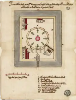 There are three fortresses here, one French, one English and one Portuguese. They are all built according to the same plan. […] At each angle there is an earthen bastion […] each outfitted with twelve iron cannons. Each fort is surrounded by a moat twenty feet wide with the same depth and in which water is rarely found. There is a bridge at the entrance that can easily be lifted in case of an attack. The French fort is the best maintained one while the Portuguese one is in the worst condition. They all have their gunpowder magazines, which are roofed with thatch, at the center of the courtyard.[9]