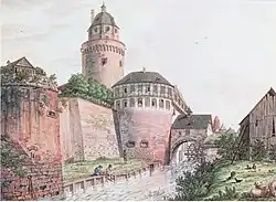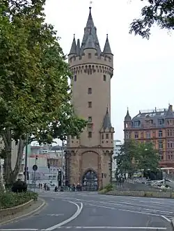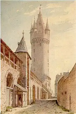 The Galgentor (gallows' gate) was the most important gate; the traffic from and to Mainz passed through it. The emperors also preferred to enter the city via the Galgentor during their elections. The gate had cuboid towers, constructed between 1381 and 1392. On the outer faces, below gothic baldachins, statues of Bartholomew the Apostle and Charlemagne stood either side of a Reichsadler, which stood on a lion.[28] One of the first towers was the Bockenheimer Tor, built between 1343 and 1346[29] The most important tower was the Eschenheimer Turm, constructed between 1400 and 1428 and still standing behind the eponymous city gate. It was the second tower to be built here. The foundation stone of its predecessor was laid in 1346.[30] The Friedberger Tor is recorded to have existed in 1346, but its tower was constructed in 1380. The tower was cuboid and had a high, hipped roof with a roof lantern on the top.[31] The construction date of the Allerheiligentor (All Hallows' Gate) is uncertain, with the sources giving dates from the 1340s to the 1380s.[32] The Sachsenhäuser Tor (Sachsenhausen gate) was more compact than the gates north of the Main. At the top of the gate, there was a cuboid tower. After 1552, the gate gained roundels on two sides; after 1769, the roof of the gate gained a small baroque tower to accommodate the chiming clock of the broken Sachsenhäuser Brückenturm.[33]