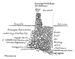 Thomas attributed the initial creation of the wall to the 9th century and considered Louis the German to have given the orders for its construction. He based this on Pingsdorf ware found close to the wall, and because Pingsdorf ware was thought to have been Carolingian.[10] During the excavations in 1976, a becherkachel made of coarse mica was recovered.[6] This type of pottery came into use at the end of the 10th century, and Pingsdorf ware is currently considered to be a post-900 development, leading to the conclusion that the wall may not have been a Carolingian construction, but an Ottonian one. Additionally, an official document from 994 describes the city as "castello" (a fortress),[11] making it reasonable to assume that the wall existed in 994, matching the archaeological findings.[12]