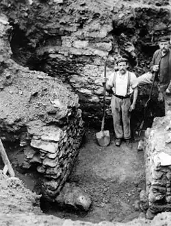 From 1953 to 1955, archaeologists continued the research and inspected the city wall in the area of the Hauptzollamt (today's Haus am Dom).[6] Archaeological studies of the area of the Saalhof from 1958 to 1961 by Otto Stamm proved the position of southern wall section along the Main and a short western part of the wall below the Saalgasse.[7] The last excavations directly connected with the historic wall were made in 1976, again on the premises of the Dompfarrhaus.[6] Archaeological research to establish the south-eastern and eastern location of the wall has not yet taken place. The stratigraphy in the area of the Römerberg was presumably significantly damaged by construction works in the Medieval period and destroyed by the construction of an underground car park in the 1970s, reducing the amount of information obtainable in this area.