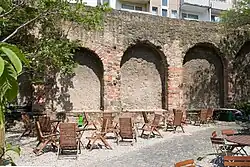 The discovery of an east-west wall at the northern Samstagsberg presupposes the existence of another gate at the position where one leaves the Römerberg today, entering the Alter Markt in the direction of the cathedral.[13] If a line were drawn from there to the findings in the area of the Saalhof, it leads to the conclusion that the east-west wall must have made a near 90° turn at this point, directly connecting to the stronger wall on the bank of the Main. However, the significant disruption of the soil below the Römerberg, which was noticed by Thomas, makes it equally possible that the previously-mentioned east-west wall section was constructed later, and was a direct connection between the north-west wall and the southern part of the wall.[6] Archaeologically, the southern part of the wall has only been confirmed to have existed as far as the Geistpförtchen. Furthermore, the simultaneous existence of the southern wall and the Ottonian wall is disputed.[14]