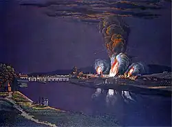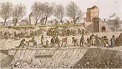 In October 1792, French troops occupied the city. While allied troops from Hesse and Prussia managed to expel the invaders on 2 December 1792, the expulsion itself clearly proved the fortifications to be useless: The allied soldiers easily managed to take the Friedberger Tor by storm. In 1795 and 1796, hostile troops again arrived in front of the city. On 13 and 14 July 1796 French aggressors bombarded the city, inflicting severe damage, a third of the Frankfurter Judengasse, which had burned down in a large fire in 1721, was destroyed again. The French government suggested that the city could destroy its fortifications to prevent being used as an arms depot and military base, and so becoming a target for attack. Subsequently, the senate ordered the creation of plans for the slighting of the fortifications.[44] As with the construction of the fortifications, planning for their demolition was a protracted process.[45] Many of the plans only provided for the demolition of the bulwarks, deliberately preserving the 14th century's city wall as a protection against criminals and as a border control for people and goods.[46] The high cost estimates caused the politicians to refuse a comprehensive plan. In 1804, after almost 20 months of discussion, the demolition was halfheartedly begun by 50 to 60 day labourers. An expert report in mid-1805 stated that, if it continued at the same speed, the deconstruction was expected to take at least nine more years.[47]