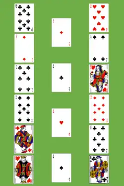 The rules were first published in England by Professor Hoffmann in 1892 under the name The Four Seasons,[3] a name subsequently assumed by another game with a different layout and packing scheme. He used a vertical layout with the foundations in the centre column. In 1898, Dick included it in his American compendium under the name Fortune's Favors and the name stuck, albeit with minor spelling variations.[4] For example, American authors, Morehead and Mott-Smith call it Fortune's Favour,[1] as does David Parlett,[5] while Coops and Moyse call it Fortune's Favor.[6][7] Parlett notes its original name of Four Seasons as an alternative. Morehead and Mott-Smith introduced a horizontal layout with the foundations as the top row.[1]
