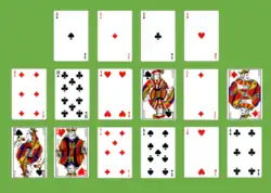 Fortune's Favor or Fortune's Favour is a patience or solitaire card game which is played with a deck of 52 playing cards.[2] It is so-called probably because the chances of winning are completely on the player's side. It is a significantly simplified version of the game Busy Aces, a member of the Forty Thieves family of solitaire games.