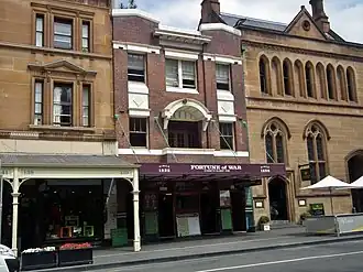 First built in 1828, the Fortune of War advertises itself as "Sydney's oldest pub".[2] However, since the present building only dates from 1922, the title is contested by the Lord Nelson Hotel (1835) and the Hero of Waterloo Hotel (1843).[3]