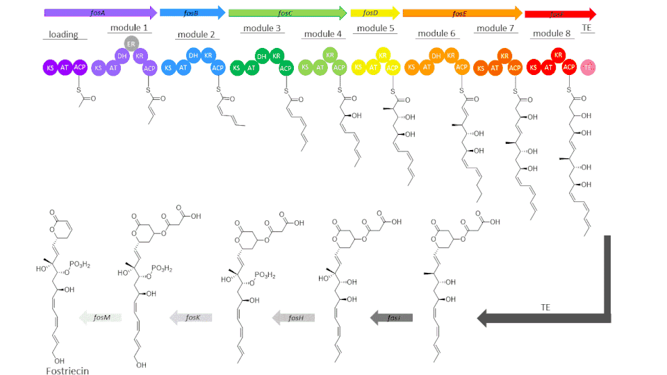 The gene cluster for fostriecin consists of 21 open reading frames (ORFs) that encode for six modular type I polyketide synthases and seven tailoring enzymes.[1] These enzymes within the fos gene have the nomenclature FosA-FosM, though not all are used in the biosynthesis of the target molecule. The six modular PKSs encoded in FosA-FosF give rise to a loading module, eight elongation modules, and a thioesterase domain.[1]