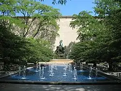 On October 31, 1907, the Ferguson Trust Board voted Taft a commission, and on December 16, he signed a $38,000 contract to commence work.[9] The commission was the first commission from the Ferguson fund.[6] Despite the financial agreement it would be some time before a determination of a site for the work. Ward's suit continued to loom over the deliberations. One proposal was to locate it in Grant Park south of the Art Institute and another was to locate it at the 35th Street and Grand Boulevard (Now Martin Luther King, Jr. Drive) intersection that now hosts the Chicago Landmark and National Register of Historic Places-listed Victory Monument.[9][21] The 1909 Art Institute annual report mentioned a proposal for a sunken garden with a focal fountain south of the institute.[9] Legal issues regarding land use intensified in 1910, and the Art Institute began to make modest plans for the fountain almost attached to the south wall of its own building.[22] For the next few years there was little mention of the fountain as Taft focused on other work.[22] Then in May 1913, the fountain model at Taft's Midway Studios was disassembled and taken to Jules Berchem's foundry for bronze casting.[22] Shepley, Rutan and Coolidge designed the base for the sculpture.[23] It was subsequently assembled by mid-August in preparation for a September 9, 1913 dedication date.[22]