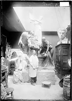 Benjamin Ferguson's 1905 $1 million charitable trust gift to "memorialize events in American History" funded The Fountain,[13] and many other public works in Chicago.[14][15] As the city attempted to determine a policy for the fund's use, Taft argued for fountains, allegorical statuary, discreetly placed portrait busts, and the adornment of bridges and park entrances in order to create long-lasting beauty in addition to supporting the style of art he pursued.[16] By September 1905 his name was linked in the press to the fund as a possible deserving recipient of its first commission.[16] During the 1905–1906 year he began to place greater emphasis on sculpture in the classes he taught at the School of the Art Institute of Chicago, while simultaneously refining earlier allegorical.[16]