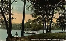 Fox Island is a minor island located in the Charles River in Waltham, Massachusetts. The island is public, uninhabited, and forested. It is owned by the Department of Conservation and Recreation (DCR). Fox Island's name is in conjunction with Fox Park in Waltham, which is just to the west by north of Fox Island, and also owned by the DCR. Fox Island was previously partially owned by Stephen B. Cram circa 1865.[1] In 1891, Harvey Bartlett opened Forest Grove and Fox Island,[2] a getaway that featured a swimming area, bathing houses, a carousel, a dance hall, a refreshment stand, and a bridge from Forest Grove to Fox Island.[3] Bartlett's business was hurt by the opening of nearby Norumbega Park in 1897, but Fox Island remained an attraction for courting couples and daring swimmers.[4]