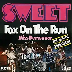 "Fox on the Run" is a song by English glam rock band Sweet, first recorded in 1974. It was the first Sweet single with the A-side written by the band, rather than by producers Nicky Chinn and Mike Chapman, and was their 14th single overall. The song became the best charting single in Australia in 1975, with six weeks at number one.[6] It also returned the group to the UK top ten after the failure of their previous single "Turn It Down" to make the top 40.