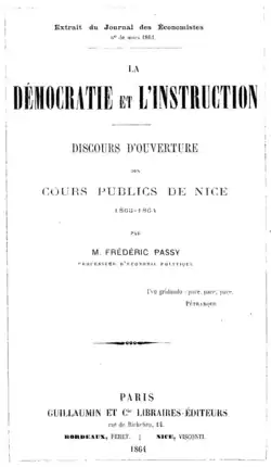 He was unable to secure a full-time position in education; he refused to swear the mandatory oath of loyalty to French monarch Napoleon III, believing his rule to be illegitimate.[3]: 34 However, Passy published several books on economics during this time, the majority of them compiled from his lectures at universities in Pau, Montpellier, Bordeaux, and Nice.[4]: 37