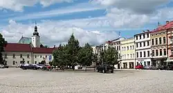 The historic centre of Místek is formed by Svobody Square, lined with preserved burgher houses with arcades.[8] Near the square is located the Church of Saint James the Great from 1622–1644. It replaced a wooden church consecrated to Saint Nicholas, which was first mentioned in 1582 and was destroyed by fire in 1602. The tower of the church is a landmark of Místek.[13]