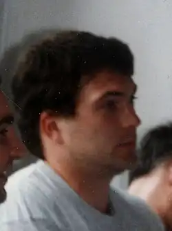 François Gilson was born in 1965 in Arolsen, West Germany, where his father, who was with the Belgian Army, was stationed. He studied art at the Academy of Fine Arts in his hometown Liège, but soon turned to writing instead of artwork. Gilson created his first comic Rebecca in 1987, with Clarke, an old friend from school (born on the same day as Gilson) with whom he had started the fanzine Cafard already in secondary school.[1] He professionally started working for Spirou magazine in 1989, where he became one of the main writers. Apart from contributing to the existing series Scrameustache, he wrote new series like Cactus Club for Bercovici, Mélusine for Clarke, and Garage Isidore for Olis (later succeeded by Stédo).