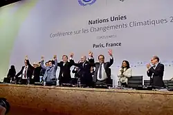One issue France is extremely active in within the UN is environmental justice and climate change. France hosted the 2015 UN Paris Climate Conference or COP21[22][23] and played a driving role in developing and enacting the Paris Climate Agreement. Beyond specifically climate change, France is also leading the fight for international environmental law, working with experts from 40 countries from around the world in different stages of development and presenting the “Global Pact for the Environment” to the UN.[24] A resolution was adopted by the General Assembly on 10 May 2018.[25]