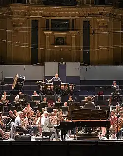 Francesco Piemontesi has given concerts with major ensembles worldwide: Cleveland Orchestra,[12] London Philharmonic Orchestra,[13][14] Bavarian Radio Symphony Orchestra,[15] City of Birmingham Symphony Orchestra,[16] NHK Symphony Orchestra,[17] Gewandhausorchester Leipzig,[18] Orchestre Philharmonique de Radio France,[19] RSB[20] and DSO[21] Berlin. He has performed with such conductors as Zubin Mehta,[22] Roger Norrington,[23] Charles Dutoit,[24] Jiří Bělohlávek,[25] Stanisław Skrowaczewski,[26] Vladimir Ashkenazy,[27] Ton Koopman[28] and Marek Janowski,[29] and has appeared in many international music festivals including the BBC Proms,[30] Edinburgh International Festival,[31] Aix-en-Provence Festival,[32] Mostly Mozart Festival.[33] and Athens Epidaurus Festival at the Herodes Atticus Ancient Theatre of Athens https://aefestival.gr/festival_events/chamber-orchestra-of-europe-konstantinos-karydis-francesco-piemontesi/