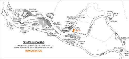 The yard is one of the oldest named shipbuilders in Bristol, as Lloyd's of London did not publish their lists before 1764, and Statutory Registers did not begin until 1786.[1] The oldest known Baylie built ship is the 280 ton (bm) merchantman Charles of 1626. Francis Baylie's first recorded navy orders resulted from Parliament approval on 28 September 1652 for a fourth rate during the Commonwealth of England period.[2] Baylie's later attracted several other orders for warships in the mid-1650s.