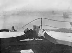 In the Transmitting Station below the armoured deck, Stoker 1st Class William Yeo was entrusted with passing on Harvey's last orders. The magazine was consequently flooded and locked up within minutes of the hit. However the cordite charges which had fallen down from gun house after the hit were not removed to safety, and there were still ready charges in the working chamber. A large number of crewmen still remained in the shell room, magazine handing room and working chamber. The fire which was thought to have been put out after the hit on the turret gained strength and ignited the remaining cordite charges, setting off a large explosion at 16:28 which killed the turret crewmen, the flame of the explosion reaching as high as the top of the ship's masts. Even with the precautions taken in hand, the magazine doors were later found to be severely buckled – only the seawater in the magazine behind it prevented the blast reaching inside.[18] Other ships of the battlecruiser fleet were less lucky; at about the same time as Harvey's death, HMS Indefatigable was torn to pieces by a series of magazine explosions that claimed 1,013 lives and just minutes after that HMS Queen Mary exploded "like a puffball" in one huge column of grey smoke, killing 1,275 sailors.[19] Hours later during the main battlefleet engagement, Rear-Admiral Horace Hood's flagship HMS Invincible was destroyed with 1,032 lives. All three ships were lost as the result of magazine explosions similar to the one narrowly avoided on Lion.[19]