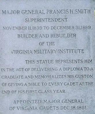 At the outbreak of the Civil War, Smith was appointed a Brevet Brigadier General in the Virginia Militia on April 24, 1861, then a colonel in the 9th Virginia Infantry Regiment on July 7, 1861. He was often absent and returned to VMI when it reopened in late 1861. He was dropped as colonel from the 9th Virginia Infantry Regiment in the reorganization of May 8, 1862[4] and then was Colonel of the VMI Infantry battalion between April 30, 1862 and May 18, 1862, May 11, 1864 and June 27, 1864 and March 1865 and April 1865. At some date not shown in the references, possibly coincident with his appointment as "major general of cadets," he was appointed a major general in the Virginia Militia.[1] He was appointed "Major General of Cadets" on December 18, 1861 according to the inscription below his statue shown in the accompanying image. Regardless whether the date of that appointment coincided with the date of his appointment as major general in the Virginia Militia, his appointments in the Confederate Army were only to positions with the rank of colonel.