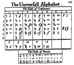 John Aubrey (1626–1697) reported that there was a group of men taking up the task of constructing a philosophical language left unfinished by John Wilkins (d. 1672). This group included Lodwick, besides Andrew Paschall (c. 1630–c. 1696), Thomas Pigott, Robert Hooke and John Ray, the latter being former members of Wilkin's original committee. Lodwick had been working on a universal alphabet for some time, and Wilkins had borrowed some of Lodwick's papers for his 1668 Essay. Hooke notes in his diary for 12 November 1673 that Lodwick had lent him a revised version of his universal alphabet. For 10 July 1675, Hooke notes that Lodwick had discussed the universal character with him and on 28 that he (Hooke) himself had written in the character. The group maintained correspondence until at least 1682.[1] Lodwick's alphabet consists of a system of representing consonants systematically; symbols indicating place of articulation (labial, dental, palatal, velar, sibilant) are modified by indication of the manner of articulation (voiced, voiceless, aspirated, nasal). Vowels are added as diacritics. This approach is entirely parallel to the tengwar alphabet, developed by J. R. R. Tolkien in the 1930s.[2]