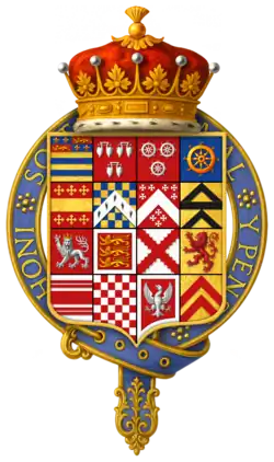 The title of Lord Ros or Roos had been carried by Elizabeth Cecil, 16th Baroness de Ros, a daughter of the third Earl of Rutland, into the Cecil family, but Rutland claimed it on the death of William Cecil, 16th Baron de Ros, in 1618. He was created warden and chief justice of the royal forests north of the Trent on 13 November 1619, and custos rotulorum for Northamptonshire on 7 February 1623. Although he seems to have disapproved of an extreme policy in church matters, his family connection with his son-in-law, George Villiers, 1st Duke of Buckingham, secured him the appointment, on 21 April 1623, of admiral of the fleet to bring home Prince Charles from Spain.[1] In 1624, Rutland and his wife were named as suspected Catholic recusants,[4] but this does not appear to have affected his standing at court. At the 1625 coronation of Charles I, he bore the rod with the dove.[5]
