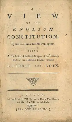 - Charles-Louis de Secondat, baron de Montesquieu; Francis Masères, transl. (1781), A View of the English Constitution. By the late Baron de Montesquieu. Being a Translation of the Sixth Chapter of the Eleventh Book of his Celebrated Treatise, Intitled L'Esprit des loix, London: Sold by B. White, Horace's Head, Fleet-Street; and H. Payne, in Pall-Mall, OCLC 642722808