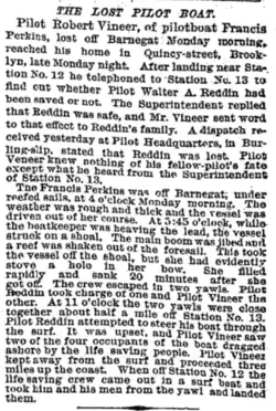 On January 24, 1887, the New York pilot-boat Francis Perkins, No. 13 was in a gale and snow storm. Thinking the that lights on the shore were from the lighthouse, the Francis Perkins struck the steamer Aries that was driven ashore by the storm wreck near the Barnegat shoals, in Ocean County, New Jersey. She sprang a leak and sank in deep waters. Six of the crew were saved and two were lost. The men tried to escape in two yawls. Pilots Robert Vineer in charge of one and Walter A. Reddin in the other. Pilot Reddin and the cook, William Dalton, were lost trying to reach the shore. The Perkins was estimated to be worth $15,000.[5][6][7][8]