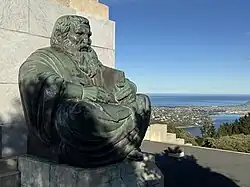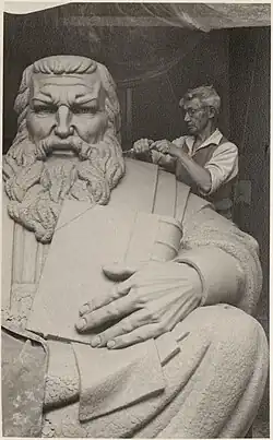 Shurrock was invited to make two large sculptures to sit on either side of the central architectural form of the Centennial Memorial on Signal Hill in Dunedin.[33] In April 1950 Shurrock presented models of the two sculptures, one of a woman spinning, known as The Thread of Life and the other titled History showing an old man holding a closed book representing the end of the century.[34] To help scale the work from models to full-sized sculptures, Shurrock was joined by former student Fred Staub who is usually given joint credit with Shurrock for the work.[35] TA plaque on the memorial records that the two figures were cast in London and installed in 1957.