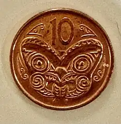 In the mid-1960s Shurrock was invited by the Coinage Design Advisory Committee to submit designs for New Zealand's new decimal coins that were to be issued on 10 July 1967. In February 1966, the designs of the six coins were leaked to a newspaper. Shurrock’s designs had already met with a negative response from the Royal Mint[36] and now the general public had an opportunity to examine drawings Shurrock had made for his coin designs, including a rugby player for the twenty cent piece.[37] The public response was immediate and negative. The Government then rejected all of Shurrock’s designs save one: Shurrock’s concept of a stylised Māori wheku (a carved representation of a human face) for the 10 cent piece was reworked by James Berry for the final coin that remains in use.[38]