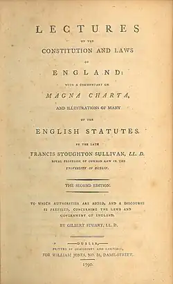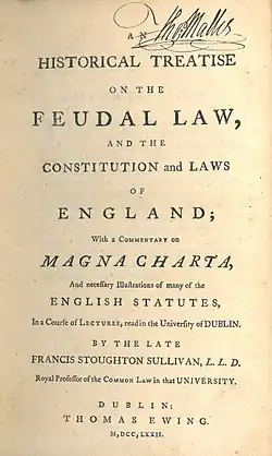 - ^ Francis Stoughton Sullivan (1772), An Historical Treatise on the Feudal Law, and the Constitution and Laws of England: With a Commentary on Magna Charta, and Necessary Illustrations of many of the English Statutes, in a Course of Lectures, Read in the University of Dublin. By the Late Francis Stoughton Sullivan, LL.D. Royal Professor of the Common Law in that University (1st Irish ed.), Dublin: Thomas Ewing, OCLC 776548497.