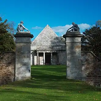 Charteris died in August 1808, aged 84 and is buried in the Wemyss Mausoleum (a huge stone pyramid) near Gosford House, the estate he had acquired in 1781 or 1784 (depending on the source).[3][4] The Earl is the only member of the family to be buried within the mausoleum.[5] His grandson Francis obtained a reversal of the attainder in 1826 and became the eighth Earl of Wemyss.[6]