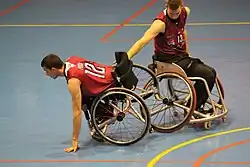 Sánchez (12) getting assistance getting back in his wheelchair during a 2013 game | |